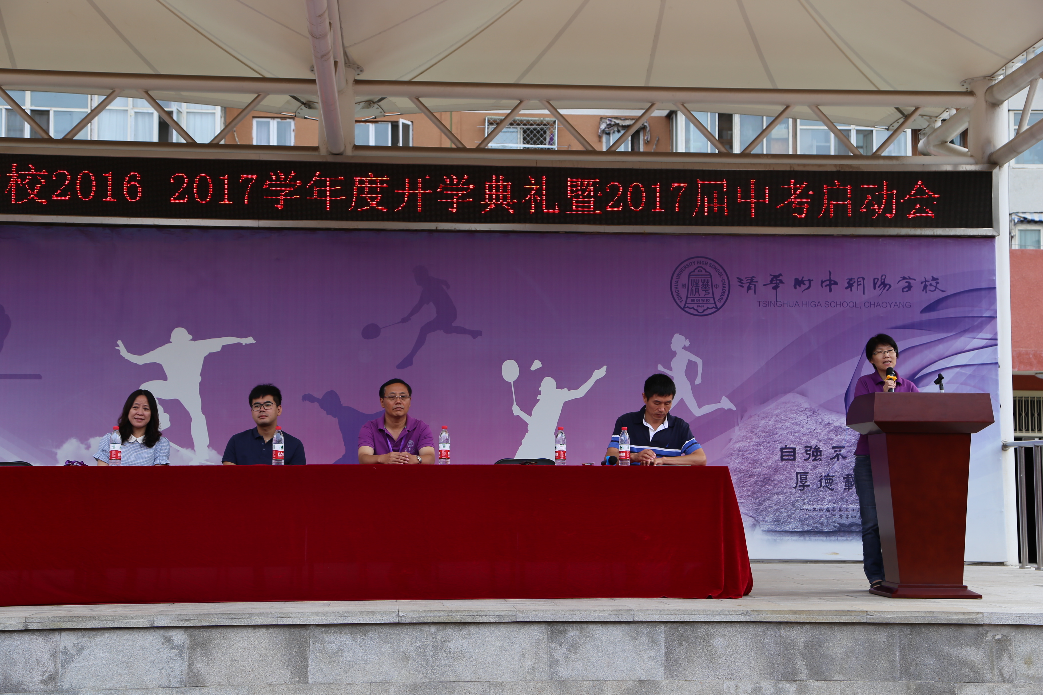 9月1日清华附中朝阳学校隆重举行了2016-2017学年开学典礼活动。新源里校区出席活动的有朝阳区政协副主席王文远、区政协专委会工作室副主任关振刚、左家庄街道办事处主任王海涛、左家庄街道办事处副主任王建萍、朝阳区教委统宣科科长何晓华、学校执行校长秦洪明、书记杜毓贞、校长助理王宏等各部门领导以及初一、初二年级全体师生。活动由史晓雨主任主持。